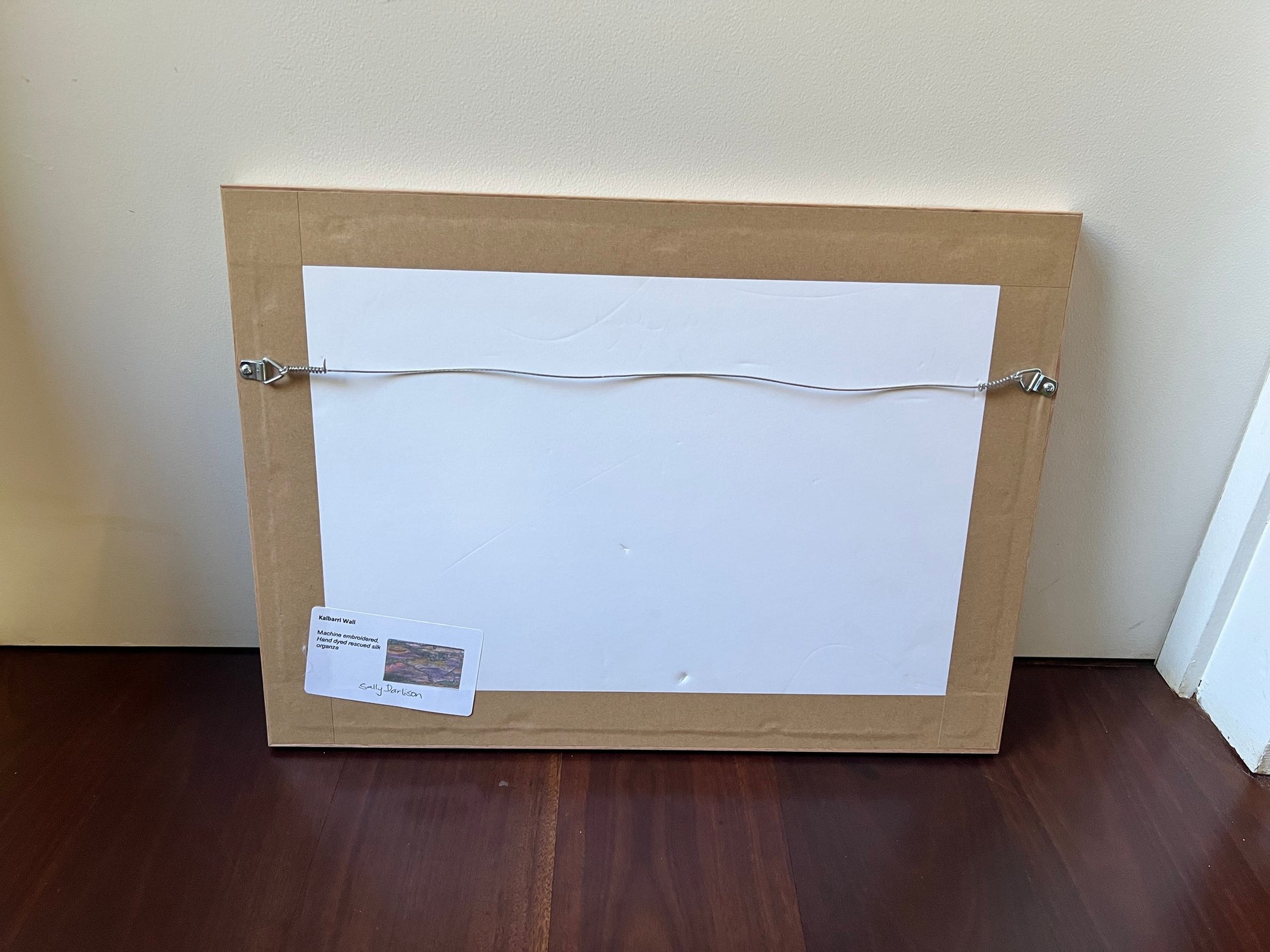 Kalbarri Wall depicts the landscape of Western Australian Outback. The art work is hand dyed silk organza and machine embroidered, framed in a Tasmanian oak frame, size 42.5 x 32.5 cm